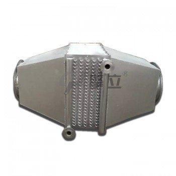 翅片管余热回收器是燃煤、油、气锅炉专用设备,安装在锅炉烟口,回收烟气余热加热生活用水或锅炉补水。其构造如图所示:下部是烟道,上部为水箱,中间有隔板。顶部有安全阀、压力表、温度表接口,水箱有进出水和排污口。工作时,烟气流经热管余热回器烟道冲刷热管下端,热管吸热后将热量导至上端,热管上端放热将水加热。为了防止堵灰和腐蚀,余热回收器出口烟气温度一般控制在露点以上,即燃油、燃煤锅炉排烟温度≮130℃,燃气锅炉排烟温度≮100℃,节约燃料4-18%。