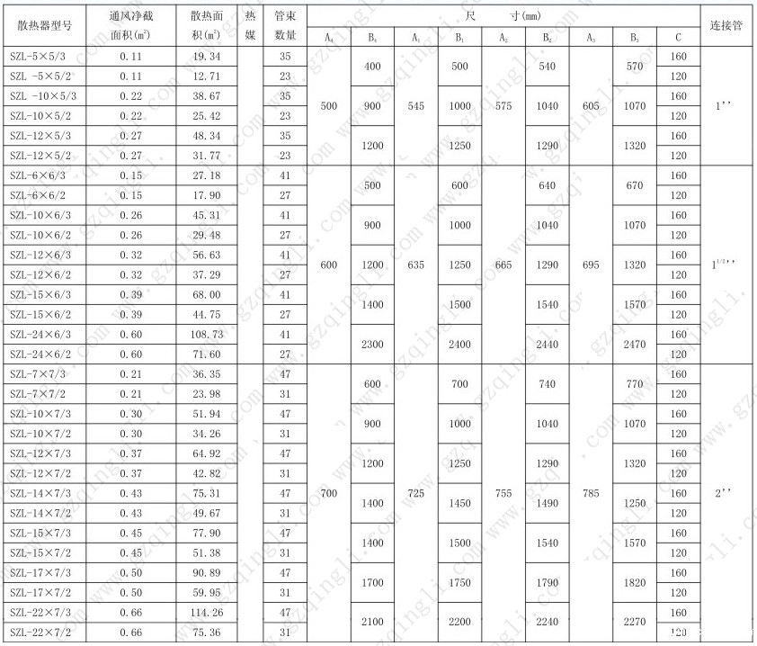 SZL型散热器翅片管有:18X2.0-38、21X2.0-44、25X2.0-50、25X2.0-55等规格,不同规格的换热器、表面根数、排数和管有效长度可以组成多种规格的散热器。热介质的流动可以分为单流程和多流程,换热介质工作压力为1.5MPa以下,工作温度为300摄氏度以下。