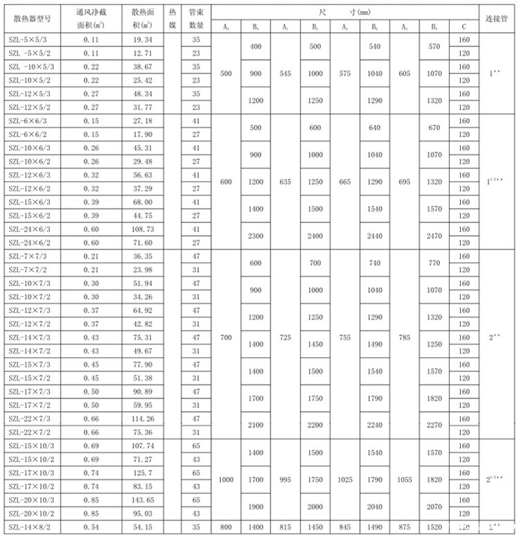 SZL型散热器翅片管有:18X2.0-38、21X2.0-44、25X2.0-50、25X2.0-55等规格;