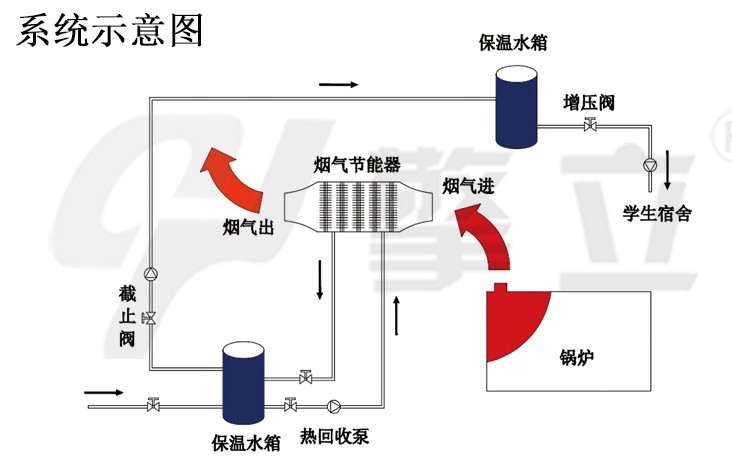 利用高效翅片管强化传热,管内走水,管外通过烟气,达到快速换热,降低排烟温度,余热回收利用的目的。