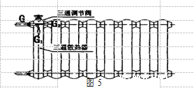 具体做法是在靠近支管的第一片散热器上增加一个调节阀 ,使其成为一个“三通散热器” ,利用第一片散热器本身作“跨越管” ,使散热器兼有跨越管和三通调节阀的作用(如图 5)。