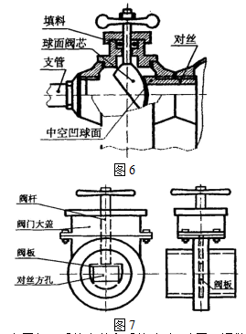 这种可调节散热器的关键部位是三通阀部分(或调节阀部分)。将散热器的上部改造为一个三通阀 ,下部作“跨越管” 。如, 可以采用这样一种做法,将第一与第二片散热器之间的对丝的一端加工成中空的环形凹球面, 而将阀杆下部的阀芯加工成斜放的半球 ,旋转阀芯实现对丝中孔开度大小的变化 ,进而实现热水流量的调节(如图 6)。当然, 阀的结构可以是与此不同的其它形式。